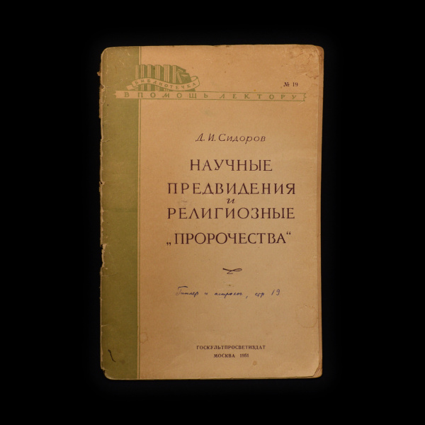 Книга «Научные предвидения и религиозные „пророчества“». Издательство «Госиздат культурно-просветительной литературы». Автор: Д.И. Сидоров. 62 стр. Ти…