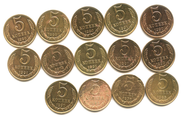 Лот монет «5 коп. 1974−1991 гг». 14 шт (СССР)