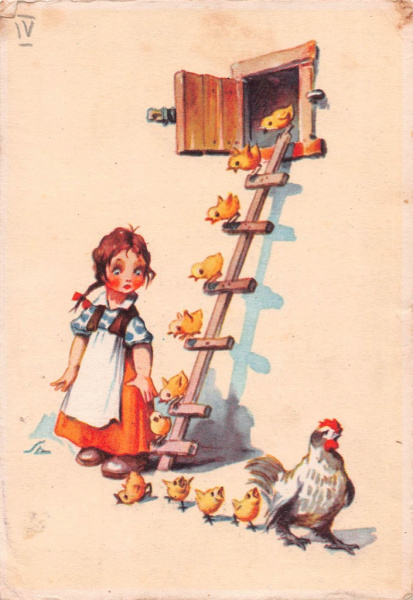 Карточка почтовая «Девочка у курятника» (Германия)