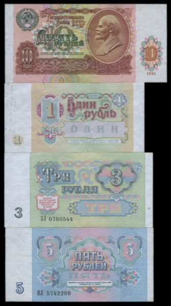 Лот банкнот «1, 3, 5, 10 рублей». 4 шт (СССР)