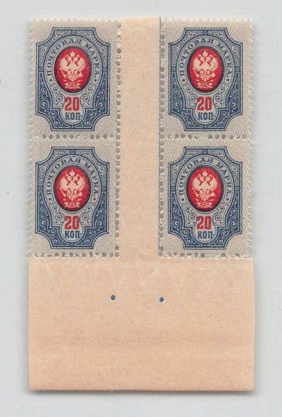 Квартблок почтовых марок 20 копеек. Люкс (Российская Империя)