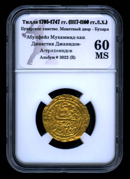 Тилла. Бухарское ханство. Монетный двор — Бухара. Абулфейз Мухаммад-хан. Династия Джанидов-Астраханидов 1705—1747. В оригинальном сертифицированном сл…