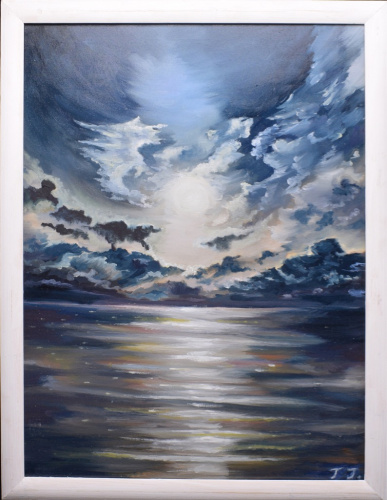 Картина «Солнце среди туч над морем». Автор: Галина Гусева. Масло, холст. Размер 34×43 см