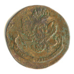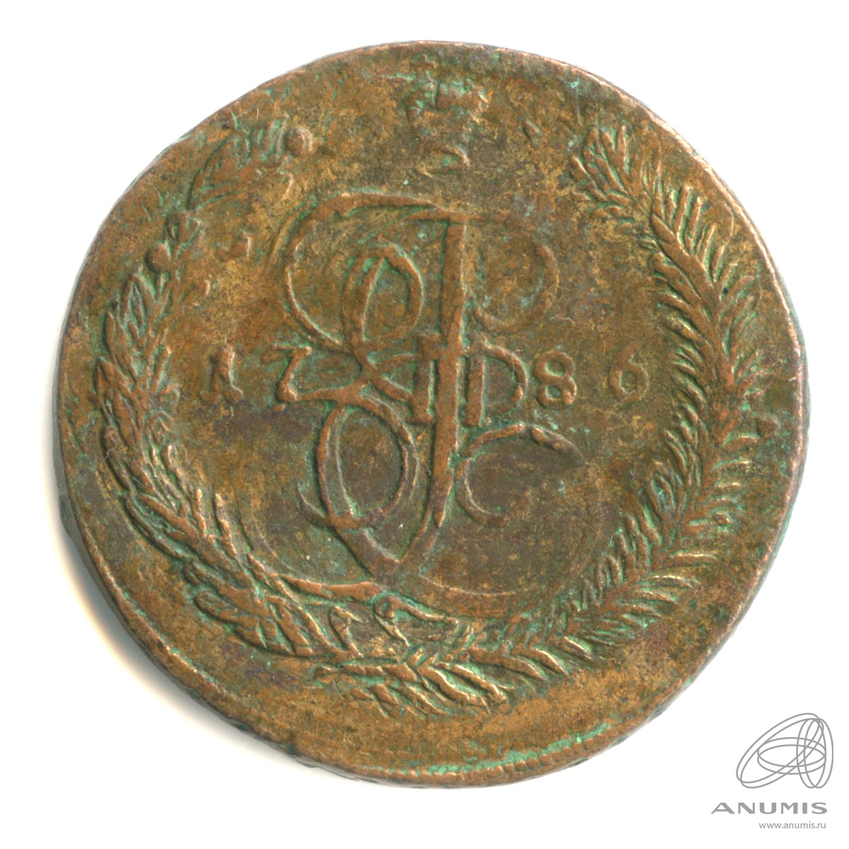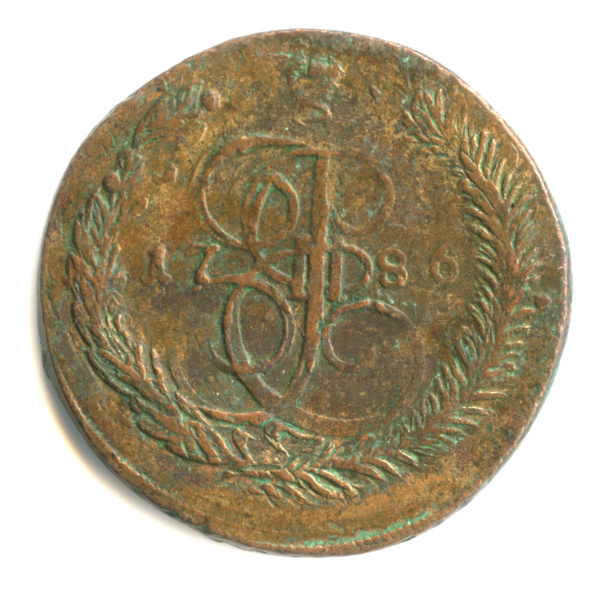 Монета регулярного выпуска: 5 копеек 1786 года «Вензель императрицы Екатерины II Великой. Орел 1780 г. Екатеринбург». 5 копеек 1763 — 1796 гг. Российская Империя: Екатерина II (1762 — 1796). Монетный двор: Екатеринбургская монета, г. Екатеринбург. Медь, 51 г, ø 42−43 мм, Гурт: Узор. Тираж: 30376500 шт.