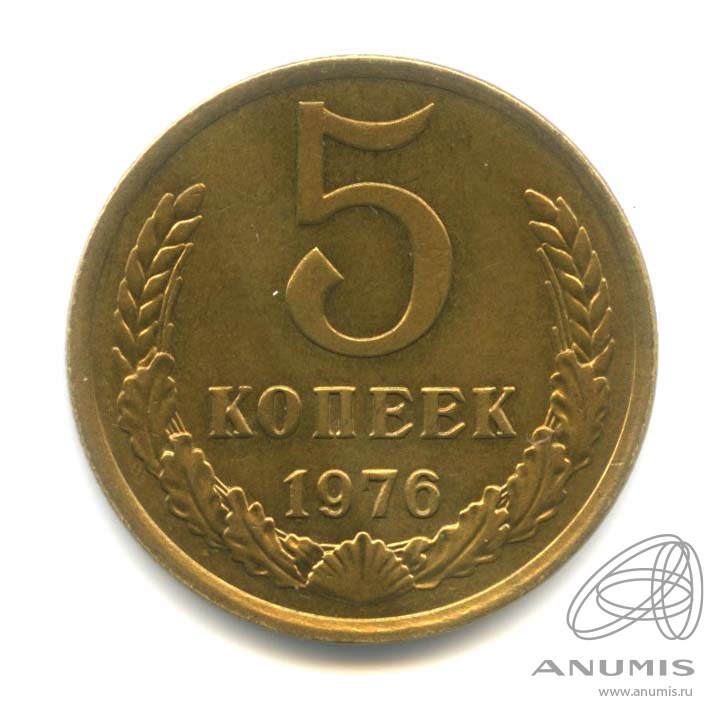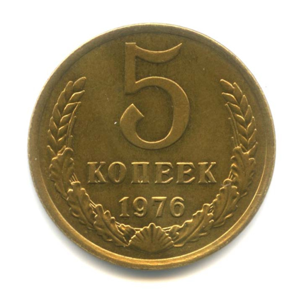 Монета регулярного выпуска: 5 копеек 1976 года. 5 копеек 1961 — 1991 гг. Союз Советских Социалистических Республик: СССР поздний (1961 — 1991). Латунь, 5 г, ø 25 мм, Гурт: Рубчатый.