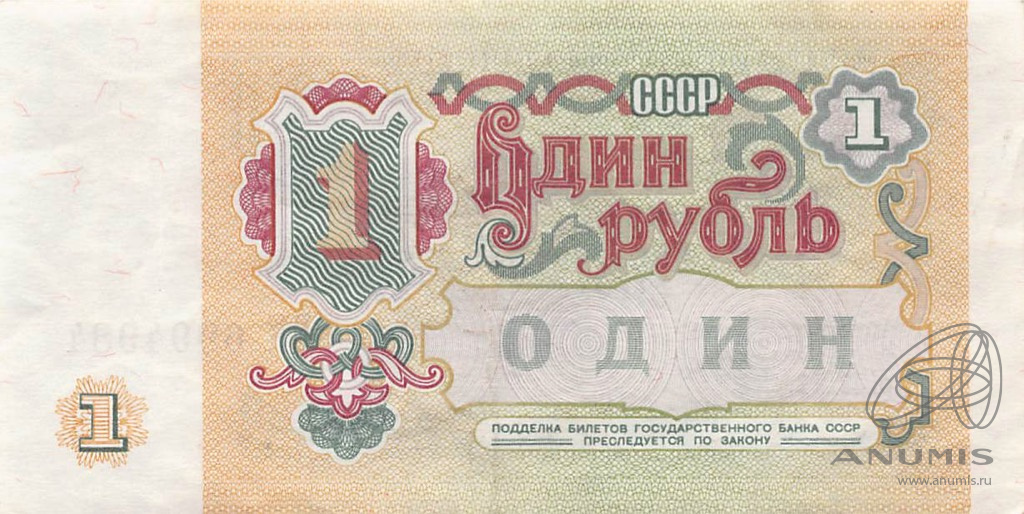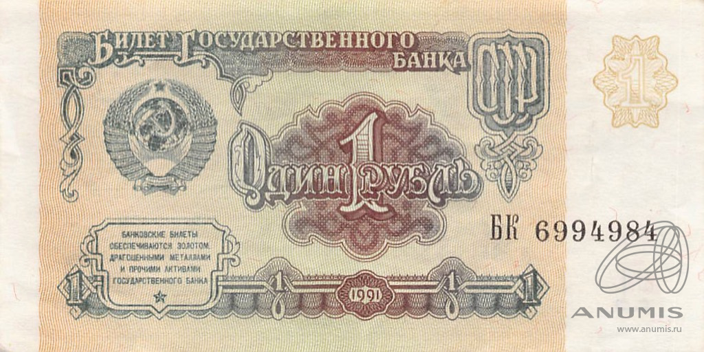 Банкнота регулярного выпуска: 1 рубль 1991 года. Билеты Государственного Банка СССР 1991 г. Союз Советских Социалистических Республик: Госбанк СССР (1991 — 1992).