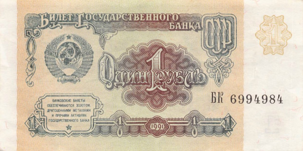 Банкнота регулярного выпуска: 1 рубль 1991 года. Билеты Государственного Банка СССР 1991 г. Союз Советских Социалистических Республик: Госбанк СССР (1991 — 1992).