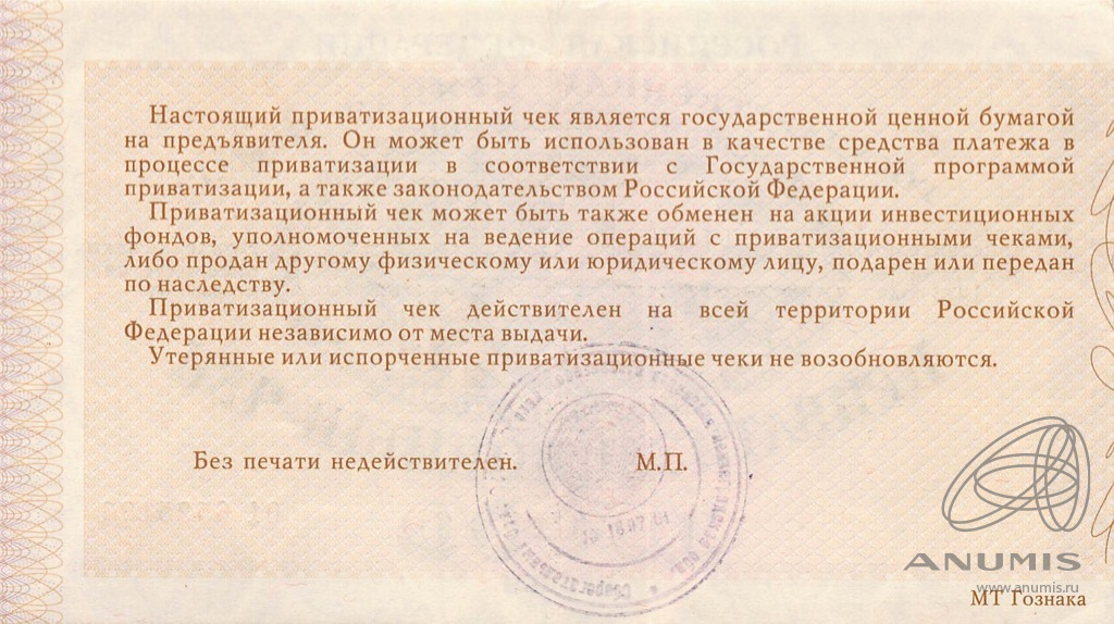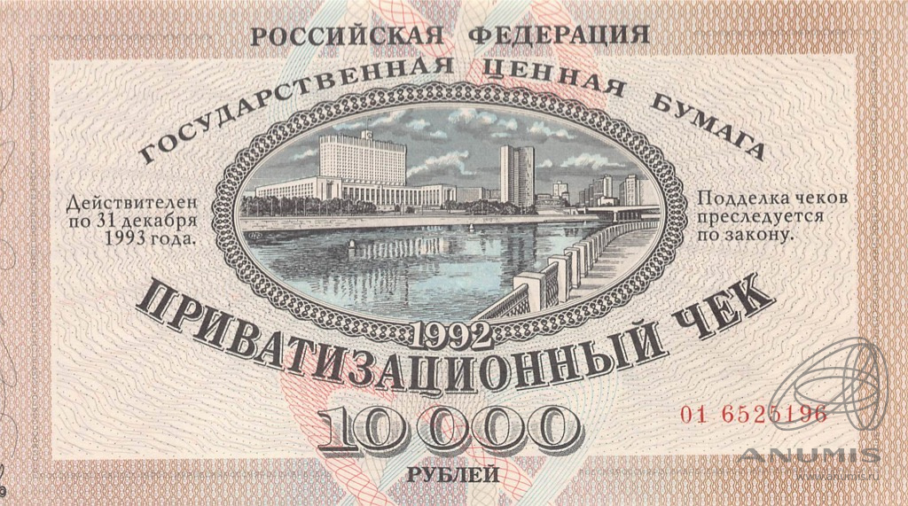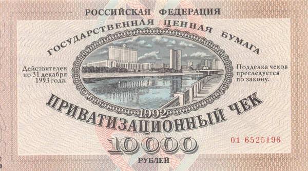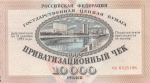 Банкнота регулярного выпуска: 10000 рублей 1992 года «Не гашеный: Без контрольного талона». Приватизационные чеки 1992 г. Российская Федерация: Банк России (1992 — 1996).