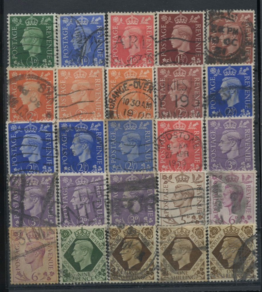 Лот почтовых марок. 1930-е. Великобритания. Личности. Персоналии. Король Георг VI. Разновидности. Гашёные. Отличное состояние. 25 шт