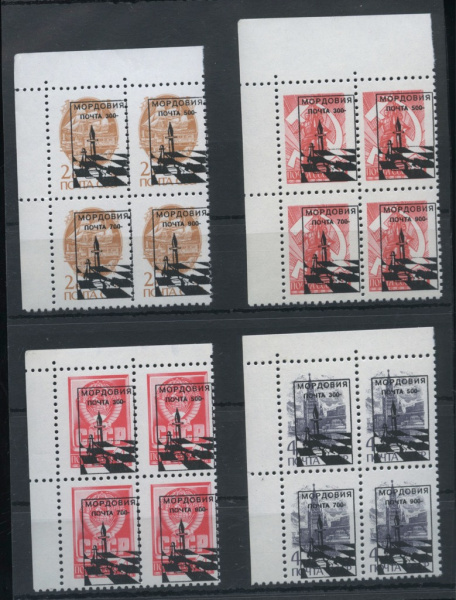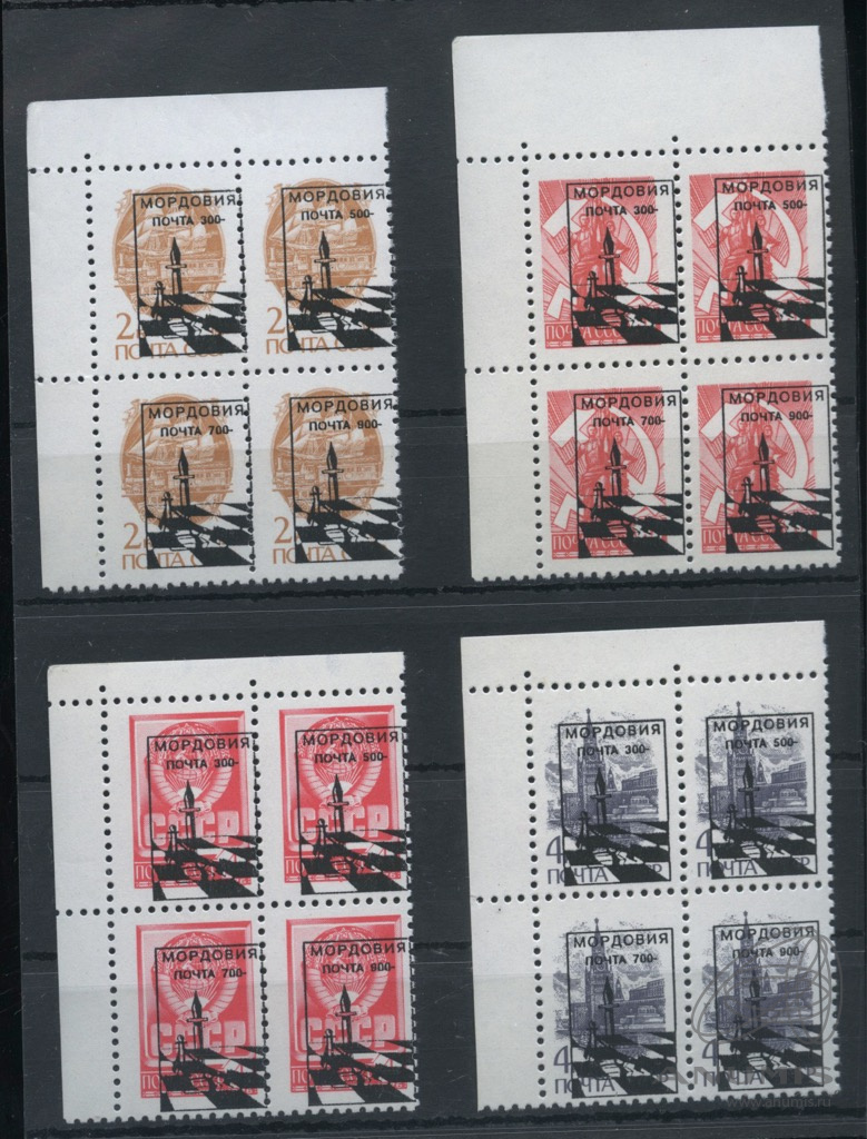 Лот почтовых марок. 1992 г. Локальный выпуск. Надпечатка на Стандартах СССР. Мордовия. Местные выпуски. Квартблоки. 4 штук. Состояние **. Чистые (Без наклеек). 16 марок