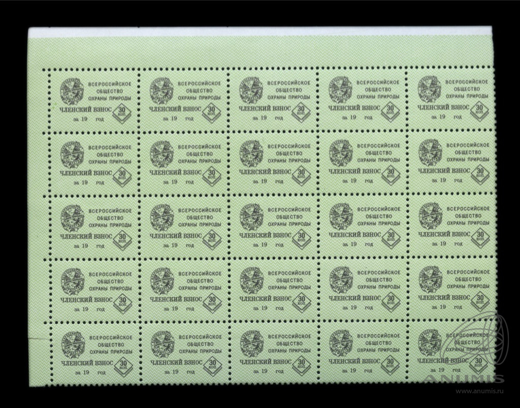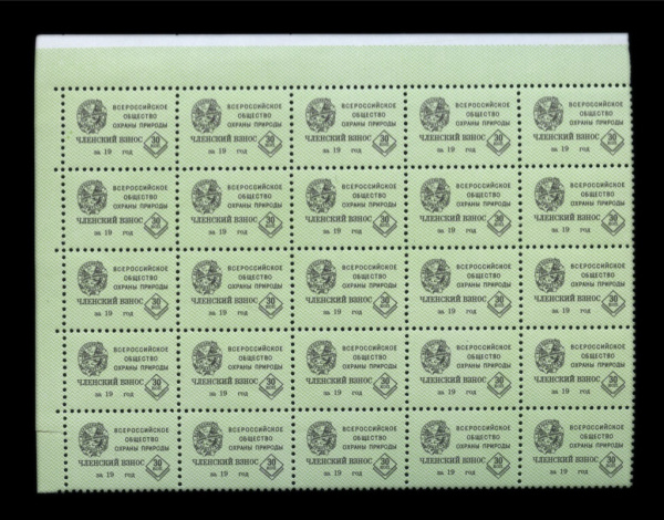 Лот непочтовых марок. 1970-е. СССР. Членский взнос. Всероссийское общество охраны природы. Номиналом 30 коп. Угловой Блок. Состояние **. Чистая (Без наклеек). 25 марок