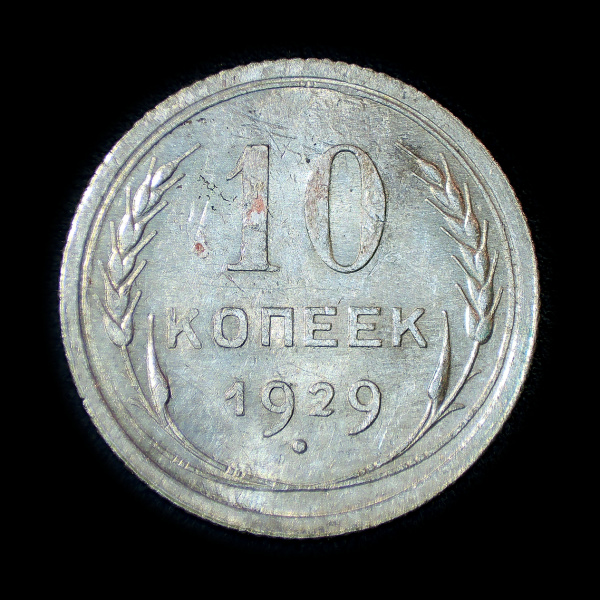 - Период с 1926 по 1935 гг. В это время от использования драгоценных металлов отказались, и все монетки, отчеканенные в предыдущий период, были переизданы. Небольшие номиналы изготовили из алюминиевой бронзы, а монетки от 10 копеек и выше — из никеля. Исключение составили полкопейки, которые по-прежнему изготавливались из меди.